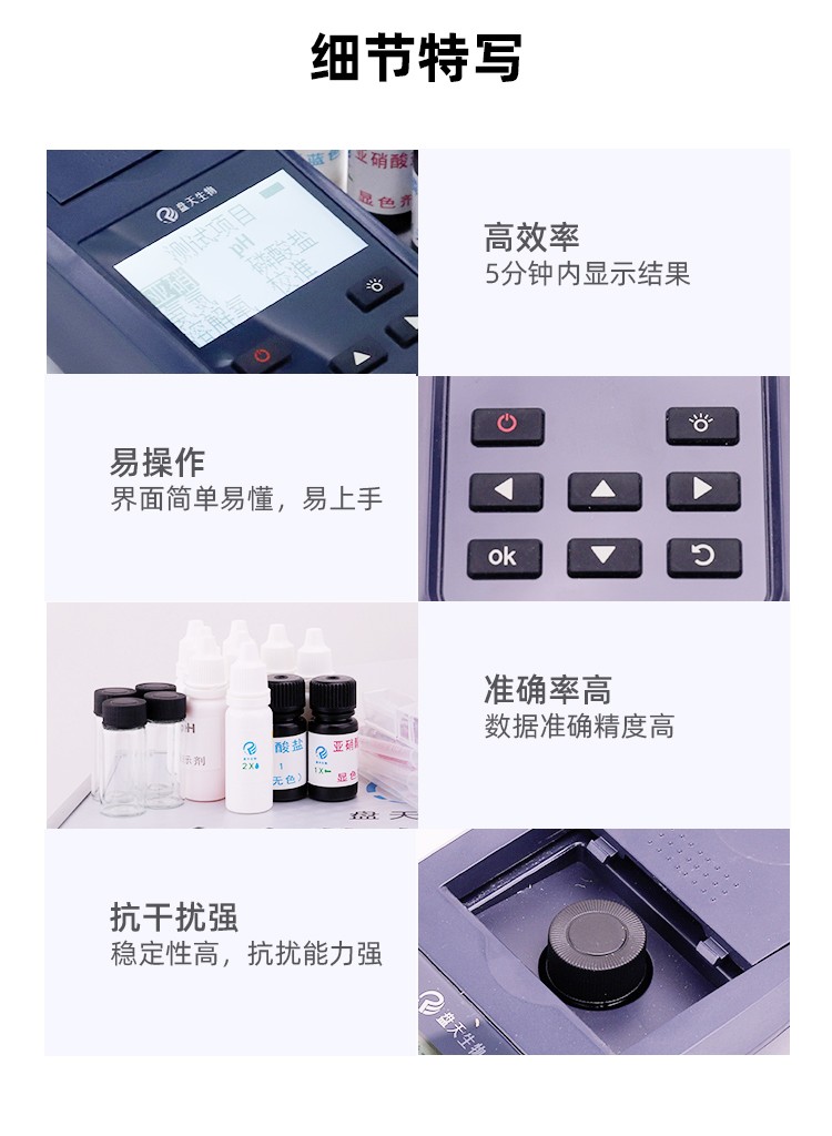 一款適用于工業(yè)污水、水產(chǎn)養(yǎng)殖等領(lǐng)域的檢測(cè)儀,配合檢測(cè)試劑,可“快速、簡單、準(zhǔn)確、穩(wěn)定”進(jìn)行測(cè)量,擁有精美的外觀造型,簡單的操作界面,準(zhǔn)確的檢測(cè)系統(tǒng),幫助用戶獲得精細(xì)的數(shù)據(jù),可更準(zhǔn)確、有效的分析水體狀況,提前預(yù)防養(yǎng)殖風(fēng)險(xiǎn),及時(shí)避免損失。 數(shù)據(jù)準(zhǔn)確,攜帶方便,檢測(cè)快速,操作簡單